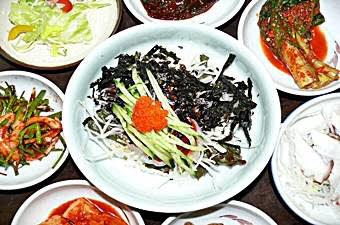 次に、このお店の看板料理の刺身をどうぞ。季節によって美味しい魚は変わりますが、何時も旬のものを出すそうです。また、簡単に刺身を食べたい場合は、センソンフェパッ(刺身定食)をどうぞ。ボリュームのある刺身をお得な価格で食べることが出来ます。このほか、新鮮な魚介類を使ったパジョンも人気です。このお店に行ったときは、醤油と味噌に注目してください。慶尚道式の自家製のものですので、ソウルや他の地方で食べるのとはかなり味が違います。ぜひ、食べ比べてみてください。