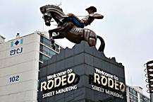 地下鉄2号線チャムシル駅で8号線に乗り換え、ムンジョン駅で降りれば、歩いて直ぐ。通りの入口のロデオ通りのシンボルとしてカウボーイの像が目印。大きな通りの両側に、100軒以上のお店が並んでいます。
