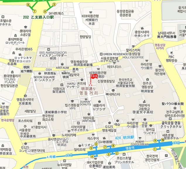 ソウル観光の中心地、明洞は、乙支路入口駅(ソウルメトロ2号線)と明洞駅(ソウルメトロ4号線)の両駅にはさまれた地域と、道を挟んだ反対側のロッテホテル ・ロッテ百貨店本店があるエリアを言います。